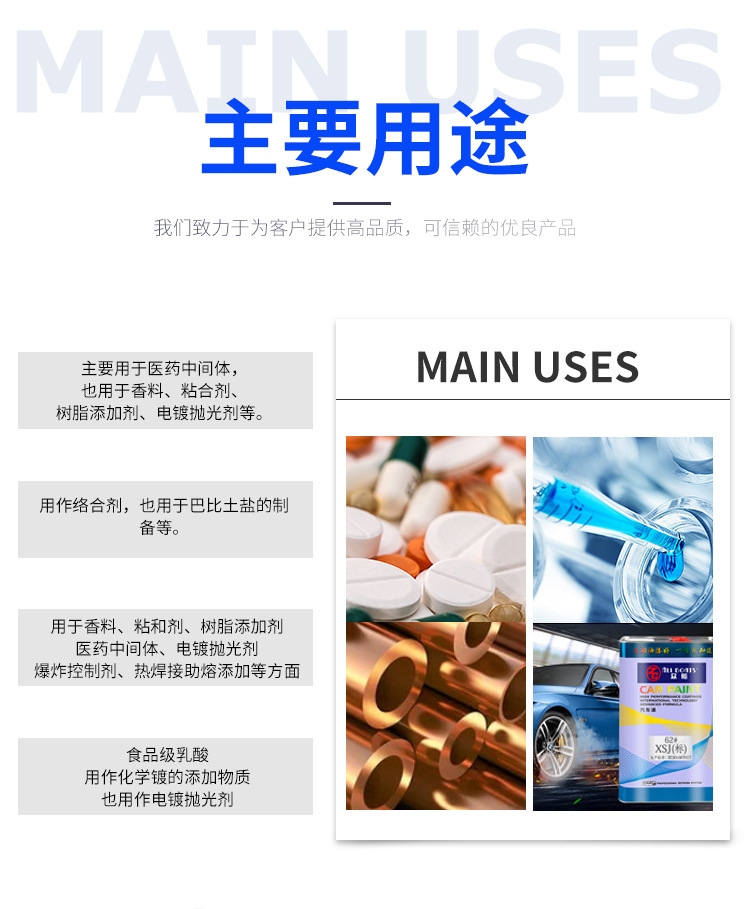 皮革鞣制、紡織印染 pH 調節劑、助染劑;可降解材料 聚乳酸(PLA) 原料;清洗劑、金屬加工液 緩蝕、除垢